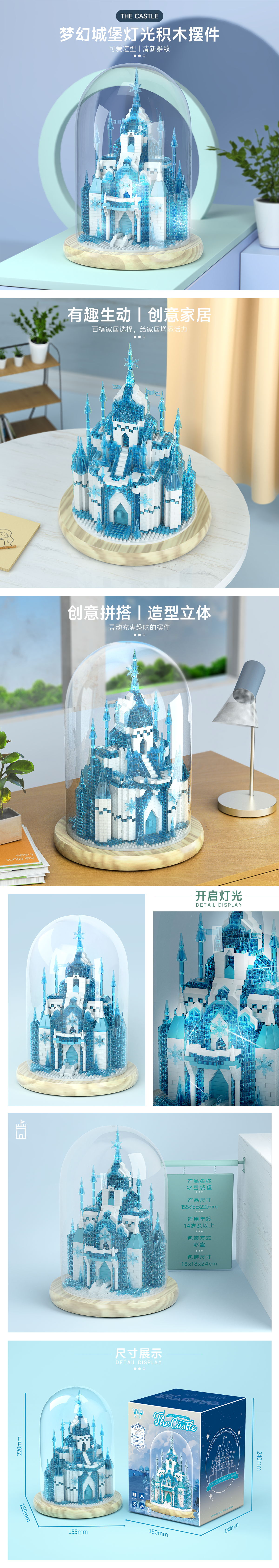 梦幻冰雪城堡(带透明罩+木质底座+灯光)